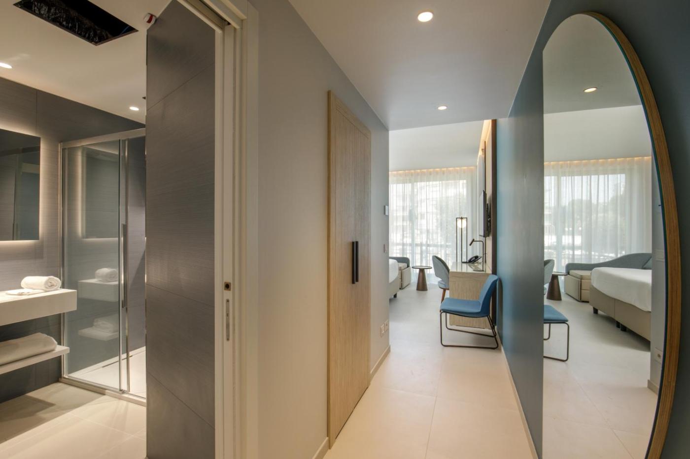Camera Deluxe MatrimonialeDoppia con Letti Singoli. Providing free toiletries, this double room includes a private bathroom with a shower, a bidet and a hairdryer. The spacious air-conditioned double room provides a flat-screen TV with cable channels, soundproof walls, a minibar, a wardrobe as well as sea views. ;