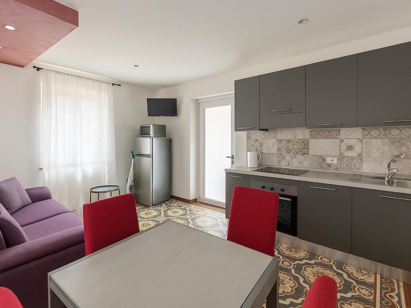 Appartamento - Piano Terra. Featuring a private entrance, this air-conditioned apartment consists of 1 living room, 1 separate bedroom and 1 bathroom with a walk-in shower and a bidet. Guests can make meals in the kitchen that is equipped with a stovetop, a refrigerator, kitchenware and an oven. The apartment provides a flat-screen TV with streaming services, a washing machine, a tea and coffee maker, a seating area as well as ancourtyard view. The unit offers 2 beds. ;